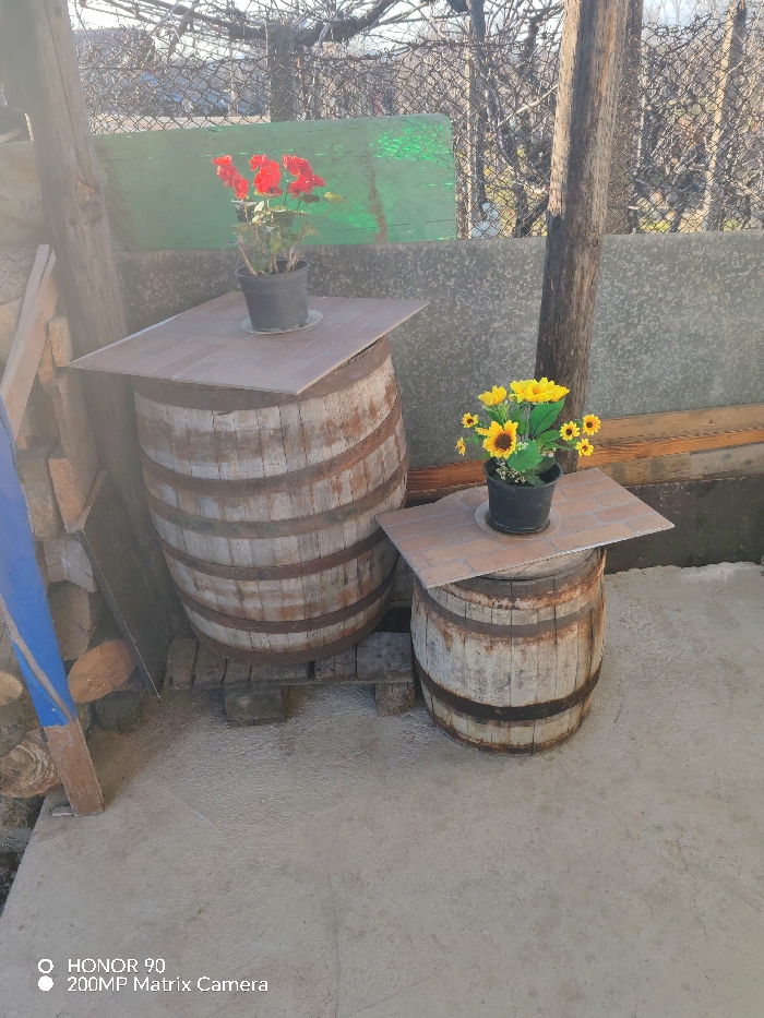 The scene depicts an outdoor area in Rosen, Bulgaria, featuring two repurposed wooden barrels acting as pedestals on a concrete ground surface. The larger barrel, positioned on the left, rests on a wooden pallet and supports a brown square tile, on which a black pot containing red-flowering plants is placed. To its right, a smaller barrel also supports a brown square tile, topped with a black pot holding artificial yellow sunflower-like plants. Behind the larger barrel, lumber and other debris are stacked, adjacent to a vertical blue object and a rough wooden post. Further back, a chain-link fence is visible, partially obscured by a green panel. Beyond the fence, a natural environment with bare trees or bushes is present under diffused daylight, suggesting a temperate climate or off-season vegetation. No individuals or specific actions are observed within the frame.