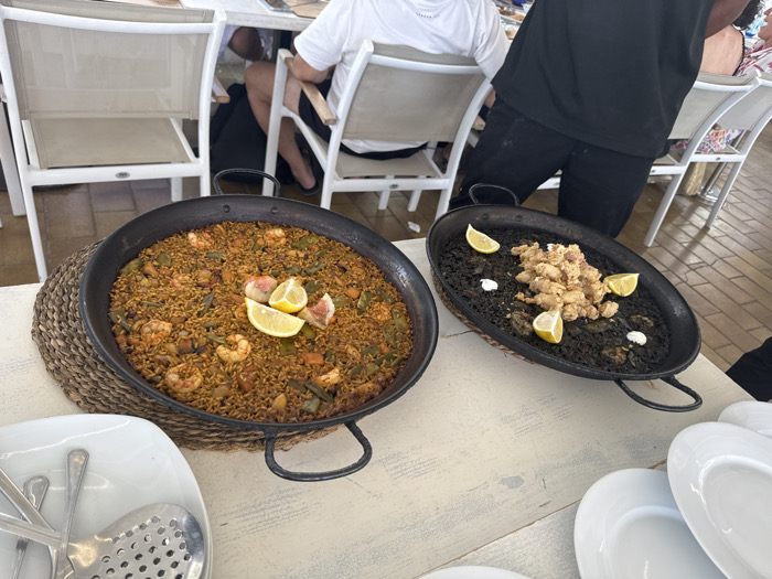 The image displays a dining scene at an outdoor or semi-outdoor restaurant in Sant Elm, Spain