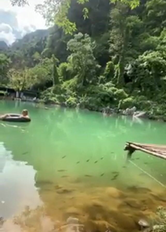 serene, clear green lake surrounded by lush greenery and rocky banks. A person in a black inner tube floats lazily on the water. Numerous small fish are visible near the lake's edge, close to a small bamboo raft. The scene is bathed in natural light filtered through the trees, creating a tranquil atmosphere.