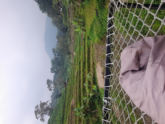 The image depicts a rural, terraced agricultural landscape in Tamiajeng, Indonesia, viewed from an elevated perspective. In the immediate foreground, a portion of a person's lower body, covered in a light brown fabric, rests upon a light-colored, wide-mesh rope net. The net is secured by white ties to a dark, possibly metal, frame. Beyond the foreground structure, an extensive valley is filled with numerous tiers of vibrant green rice terraces, interspersed with lighter brown areas of tilled earth or harvested fields. Lush green trees and vegetation, including what appear to be banana plants, are abundant throughout the valley and along the terraced slopes. Several small, rustic structures or huts with dark roofs are visible within the terraced landscape on the left side of the midground. The background features distant, verdant hills or mountains, partially obscured by an overcast, hazy light gray sky. No specific individuals are discernible within the wider landscape.