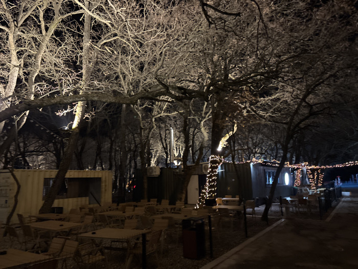 This nighttime scene depicts an outdoor recreational and dining area within a park-like setting in Haskovo, Bulgaria. The environment is dominated by numerous large, bare deciduous trees, illuminated from below by artificial lights highlighting their trunks and branches against a dark sky. Several modified industrial shipping containers or similar structures are present, appearing to serve as permanent commercial establishments, possibly cafes or restaurants. One structure on the left features light-colored wood paneling and an open service window. Another, centrally located, is dark corrugated metal with a door and windows, heavily adorned with warm white string lights draped across its facade and extending into the surrounding trees. An extensive outdoor seating arrangement consists of numerous unoccupied wooden tables and matching chairs, arranged on what appears to be a gravel or paved surface. No individuals are visible within the frame. The area is brightly illuminated by various artificial light sources, including spotlights on trees and decorative string lights, suggesting an active or recently active commercial zone during winter months. A paved pathway runs along the right side of the seating area, and a red and black refuse bin is partially visible in the lower left foreground.