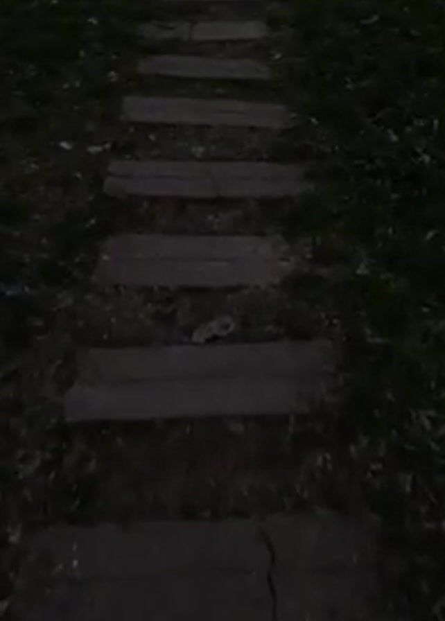 first-person view of someone walking on a stone pathway. The pathway is made of rectangular stones placed in a straight line, surrounded by grass and some fallen leaves. The scene is dimly lit, suggesting it is either dusk or a shaded area. The camera moves steadily forward, capturing the texture and cracks in the stones as they are stepped upon. No people or distinct objects are visible besides the pathway and the surrounding natural elements.
