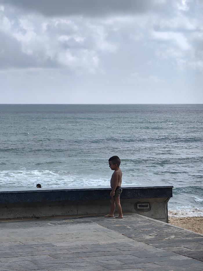 The image depicts a coastal scene in Thành phố Tuy Hòa, Vietnam, under an overcast sky. A young, barefoot male child, approximately 3-5 years old, stands in profile on a dark grey paved promenade in the foreground. He is shirtless and wears dark patterned swim trunks, facing left with his gaze directed downwards or slightly ahead. A dark concrete barrier, with a visible recessed rectangular panel on its facade, separates the promenade from the water. To the left of the child, within the ocean beyond the barrier, the head and shoulders of an adult or older child with dark hair are partially visible amidst light waves, indicating a person swimming or wading. The ocean, characterized by a grey-green hue with small whitecaps, extends to a flat horizon beneath a uniformly grey, cloudy sky. A strip of sandy beach is visible at the base of the concrete barrier on the right side of the frame.