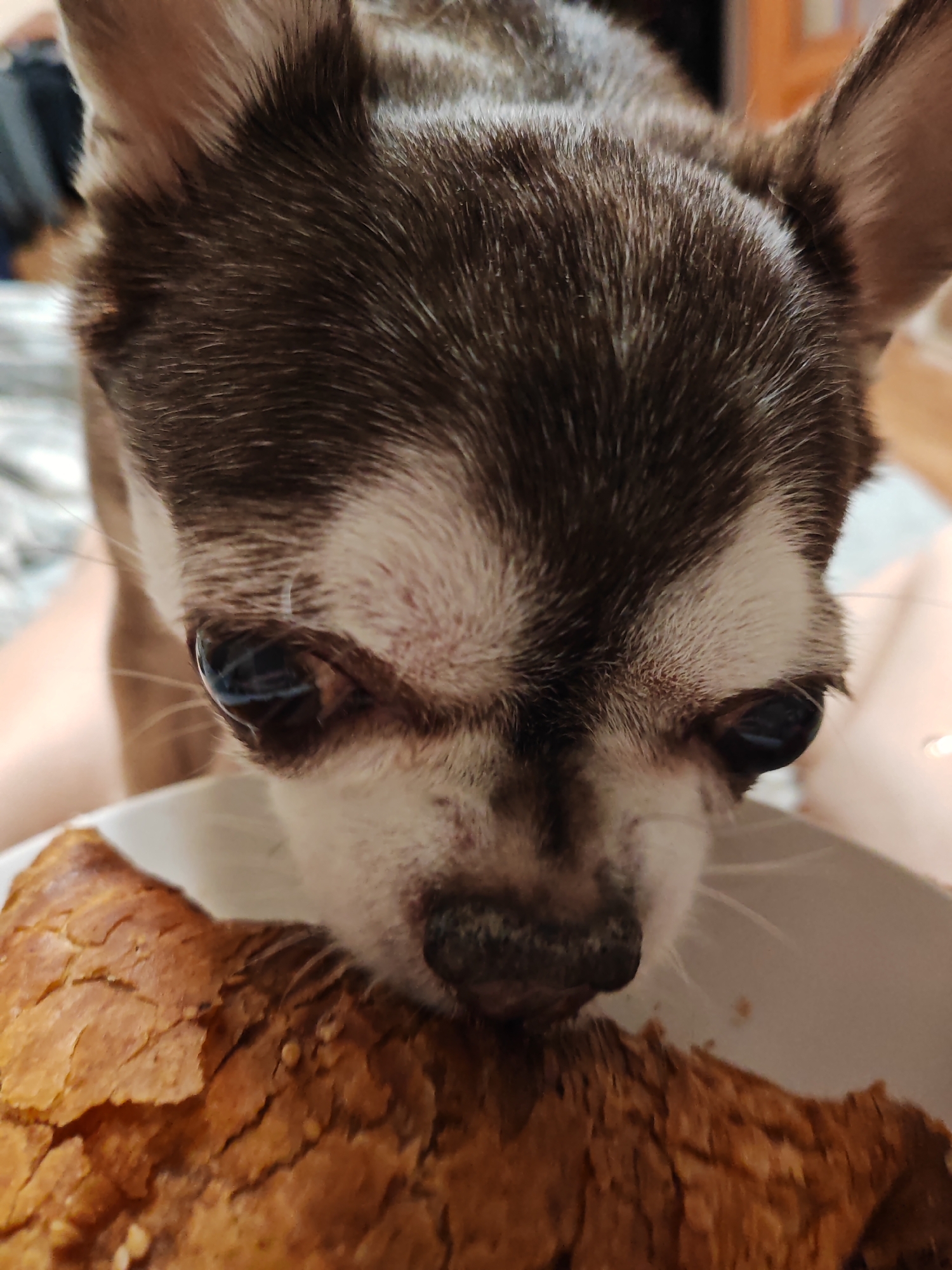 The scene depicts a close-up, indoor view of a small domestic dog, identifiable by its short brown and white fur, prominent dark eyes, and dark snout. The dog's head is oriented downwards, bringing its muzzle into close proximity with a large, golden-brown baked food item, which displays a flaky, textured surface consistent with pastry or bread. This food is partially contained within a visible segment of a white, shallow vessel, likely a bowl or plate, at the bottom of the frame. The dog appears to be sniffing or consuming the food. The background is out of focus, revealing indistinct shapes and warm tones characteristic of an indoor setting, with a segment of a light-skinned human leg partially visible in the upper left. This event is contextually located in Saint Petersburg, Russia.