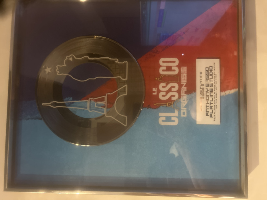 A framed platinum record award is displayed, featuring a black vinyl disc with white cut-out silhouettes of the Eiffel Tower and the Statue of Liberty, topped by a small star. The background behind the disc is vertically split, presenting light blue on the left and red on the right. Below the disc, the white text "LE CLASSI CO ORGANISÉ" is visible, with the 'A' in "CLASSICO" stylized as the Eiffel Tower and the 'O' as the Statue of Liberty. A white rectangular plaque at the bottom of the frame specifies: "DISQUE DE PLATINE," "REMIS À ANTHONY E ASSO," "FLATLINE STUDIO," "POUR PLUS DE 100.000 ALBUMS VENDUS EN FRANCE," and "CERTIFIÉ SNEP - JANVIER 2022." The award is housed in a light-colored frame with a glass front, exhibiting reflections, including a faint image of a computer monitor displaying audio editing software. This award is located within the Flatline Studio in Saint-Ouen-sur-Seine, France.