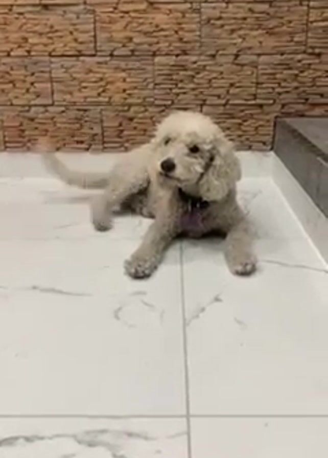 A small white poodle is lying on a white marble floor. The dog is wearing a purple collar. Behind the dog is a wall with faux stone bricks. A person is speaking in the background. The dog is looking towards the speaker, then turns its head to look at the camera.