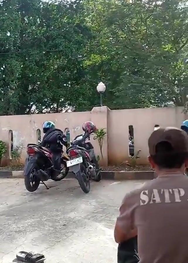 n outdoor setting with a table in the foreground, covered in red tiles. On the table are several items, including a green patterned cushion, a phone, a lighter, a pack of cigarettes, an ashtray, plastic cups containing a dark liquid, and another pack of cigarettes. Behind the table, there is a paved area with three motorbikes parked against a low, light-colored wall. Shrubs are planted along the wall. In the background, there are trees and a glimpse of a building. One person is visible, facing away from the camera, wearing a t-shirt with "SATPAM" printed on the back. Other individuals are partially visible near the table. A person is seated on one of the motorbikes, wearing a helmet. The overall impression is that people are taking a break outdoors.