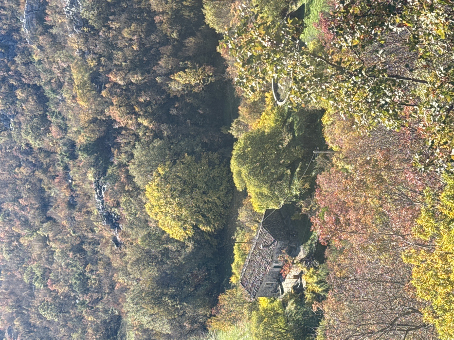 This image captures an elevated, high-angle view of a rural landscape in Gornja Brova, Montenegro, during autumn. The scene is dominated by dense deciduous tree cover exhibiting varied fall foliage in shades of yellow, green, orange, and reddish-brown. In the mid-ground, a single-story, stone-built residential structure with a reddish-brown tiled gabled roof is centrally positioned. The house features a visible chimney on the roofline and what appears to be a paved terrace or patio area on its left side, partially shaded by surrounding trees. A dark utility pole is situated to the right of the house, with a wire extending towards it. Further to the right of the house, partially obscured by foliage, is a circular stone structure, possibly a well or cistern. The immediate vicinity of the house contains several trees with vibrant yellow and green leaves, contrasting with the broader autumnal palette. The background consists of rolling hills or mountains, heavily forested with similar mixed autumn colors, and some visible rocky outcrops. The foreground is filled with trees and branches, some with red and orange leaves, partially framing the view of the house. No individuals or specific actions are discernible within the frame. The lighting suggests a clear, sunny day.