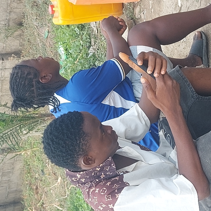 The scene depicts two individuals seated outdoors in Gudi, Nigeria. In the foreground, a young adult male with short dark hair wears a short-sleeved shirt, off-white on the lower half and brown with a repeating light monogram pattern on the upper half. He is focused downward, operating a dark-colored smartphone held in both hands. Behind him and slightly to the right, a second individual, with dark braided hair pulled into a bun, wears a blue and white athletic shirt with yellow trim on the sleeves, grey shorts, and dark slide sandals. This individual is seated, looking towards the right side of the frame, with hands resting in their lap. To the far right, a yellow plastic jerry can with a red cap is partially visible, alongside another orange container. The ground consists of dirt with scattered green vegetation. A concrete block wall is present in the distant left background, with dense foliage visible in the center-right.