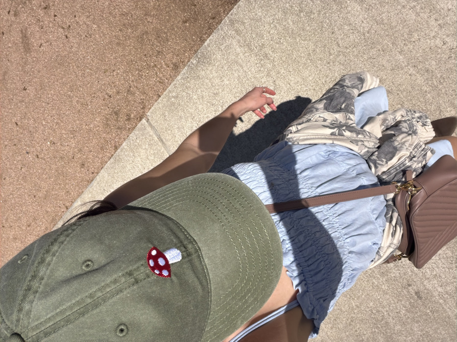 The image presents an overhead perspective of an individual standing outdoors in Houston, Texas, under bright daylight. The subject wears an olive-drab baseball cap with a red-capped, white-stemmed mushroom embroidery on the front. A light blue, smocked top or dress is visible beneath the cap. A patterned garment, likely a jacket or shirt featuring off-white fabric with dark grey or black botanical motifs, is draped or tied around the waist. A brown, quilted cross-body bag with a visible gold zipper detail hangs on the subject's left side. The individual's right arm is partially visible, with a ring on a finger. The ground consists of two distinct surfaces: a light grey concrete pathway where the subject is positioned, and an adjacent area of reddish-brown granular material, consistent with decomposed granite often found in public parks or outdoor recreational areas within Houston. Strong shadows are cast, indicating direct sunlight.