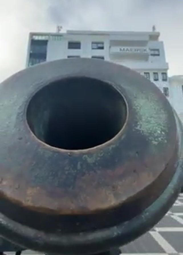close-up view of the opening of a large, weathered cannon. The camera then pans out to show the entire cannon mounted on a wooden carriage with wheels. There are other cannons lined up behind it. In the background is a cityscape with modern white buildings. People are walking around the cannons in a paved square with a black and white checkered pattern. A building with a "MAERSK" sign is visible. The sky is overcast.