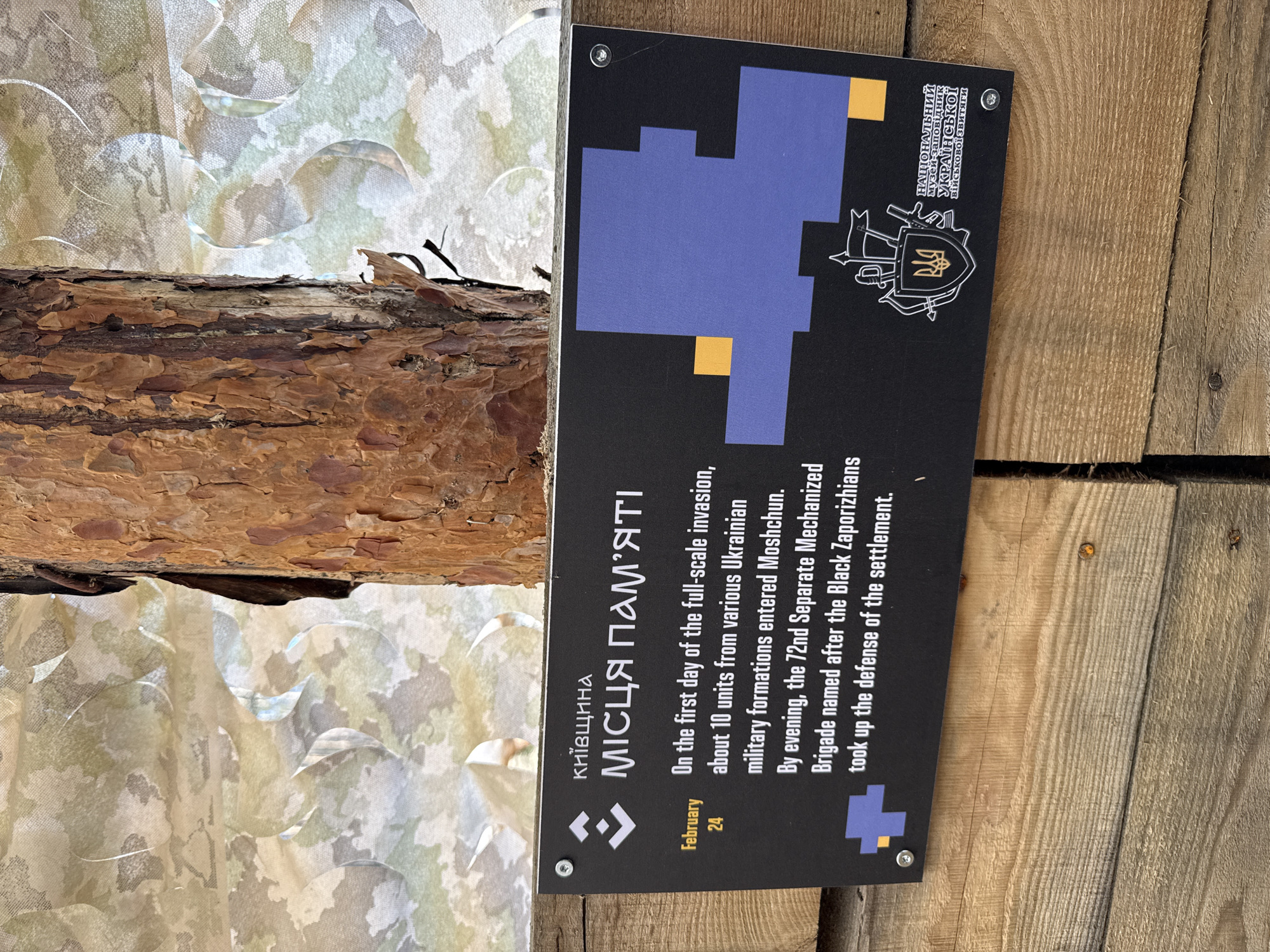 An informational plaque, primarily black with white and yellow text, is prominently displayed outdoors in the city of Moshchun, Kyiv region, Ukraine. The plaque is affixed with four screws to a rough, light-brown wooden plank structure. To the right of the plaque stands a tree trunk with coarse, reddish-brown bark. Above both the plaque and the tree trunk, a light-colored camouflage netting with green and beige patterns is visible, creating a textured background. The plaque's text, in both Ukrainian and English, details events from February 24, the first day of the full-scale invasion: "On the first day of the full-scale invasion, about 10 units from various Ukrainian military formations entered Moshchun. By evening, the 72nd Separate Mechanized Brigade named after the Black Zaporizhians took up the defense of the settlement." The top left corner features the Ukrainian phrase "КИЇВЩИНА / МІСЦЯ ПАМ'ЯТІ" (Kyiv Region / Places of Memory) next to a stylized arrow graphic. The right side of the plaque displays a pixelated map-like graphic in blue with scattered yellow rectangles, alongside an emblem featuring the Ukrainian trident surrounded by military symbols, and the inscription "НАЦІОНАЛЬНИЙ МУЗЕЙ-ЗАПОВІДНИК УКРАЇНСЬКОЇ ВІЙСЬКОВОЇ ЗВИТЯГИ" (National Museum-Reserve of Ukrainian Military Valor).