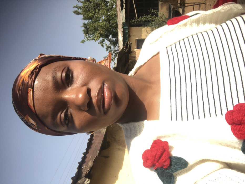 An individual, appearing female, is depicted in a close-up, chest-up shot under clear blue skies in Jos, Nigeria