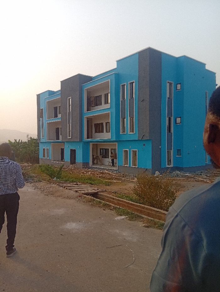 A recently built, three-story residential building is showcased with a blue and gray exterior. The structure features multiple balconies and vertical window placements. A man in a checkered shirt and dark pants walks on a paved road in the foreground. Another man with a blue shirt is partially visible. Unfinished landscaping with scattered wood pieces surrounds the base of the building. In the background are hills with foliage under a muted sky. A small concrete drainage ditch cuts across the foreground.