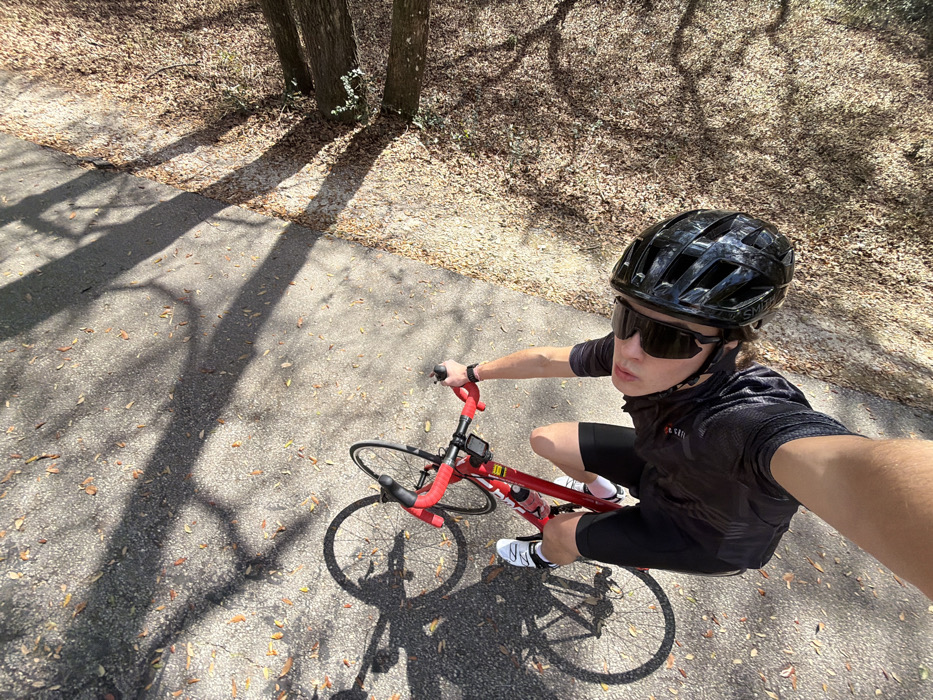 - "An overhead photograph depicts an individual on a red road bicycle stopped on a paved path in Gainesville, United States" by FM-iTlk52, licensed under CC BY 4.0