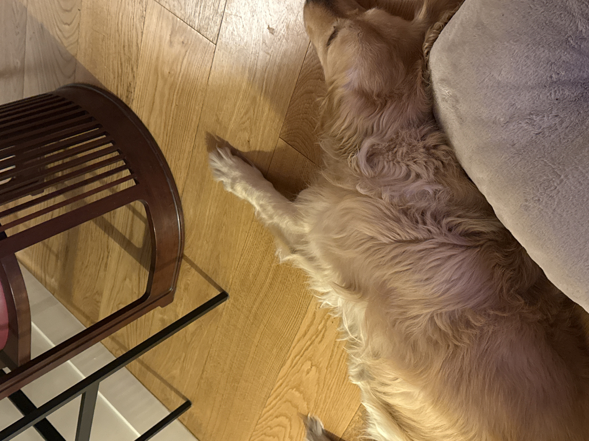 This image captures an indoor setting in Neuilly-sur-Seine, France. The primary subject is a golden retriever dog, lying on its right side on a light-colored wooden plank floor. Its eyes are closed, indicating it is asleep or resting. The dog's head is supported by a light grey or beige fluffy cushion. Its left front paw is extended upwards. In the upper left background, a dark-colored, thin metal frame is partially visible. To the upper right, a dark brown wooden object with multiple vertical slats and a curved base is present. A light-colored wall with a white baseboard runs along the background. The environment is illuminated, creating distinct shadows from the furniture on the wooden floor. No human subjects are visible.