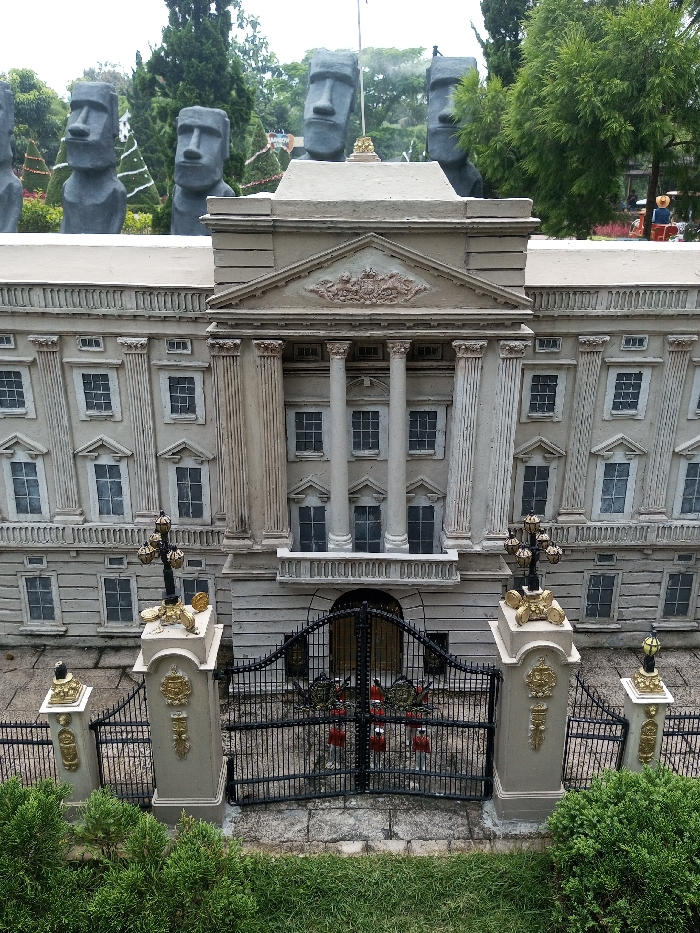 - "The image displays a detailed miniature model of Buckingham Palace, situated within a park setting in Ciherang, Indonesia" by FM-nNifI2, licensed under CC BY 4.0