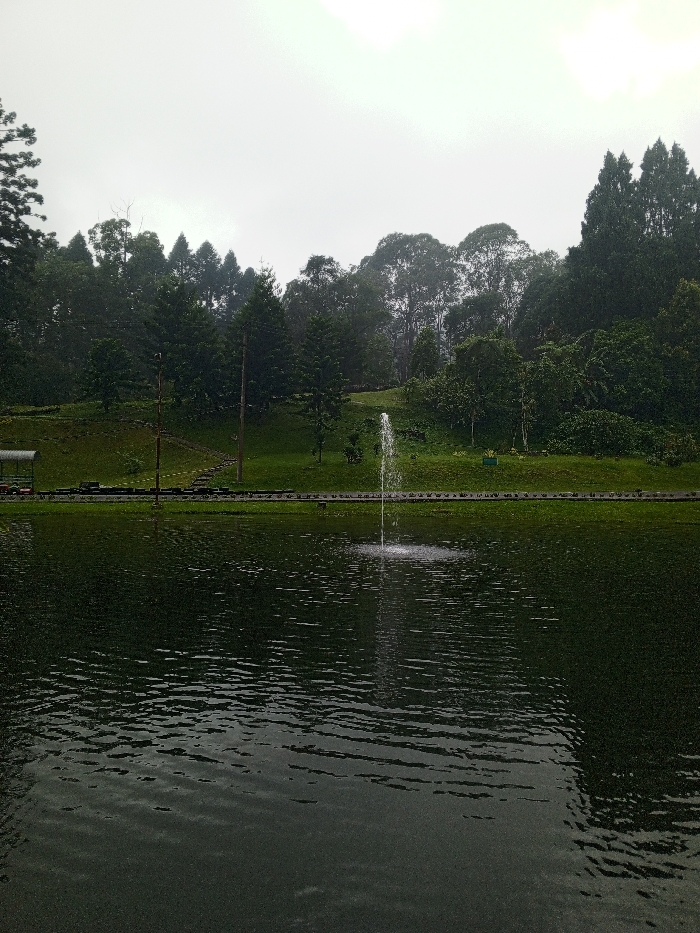 A serene view of a dark, still lake reflecting the cloudy sky. A slender fountain erupts from the water's surface, creating ripples. Lush green trees and grass cover the landscape behind the lake, adding depth to the scene. A small structure is visible on the left. The overall atmosphere is calm and tranquil, typical of a landscape on an overcast day.