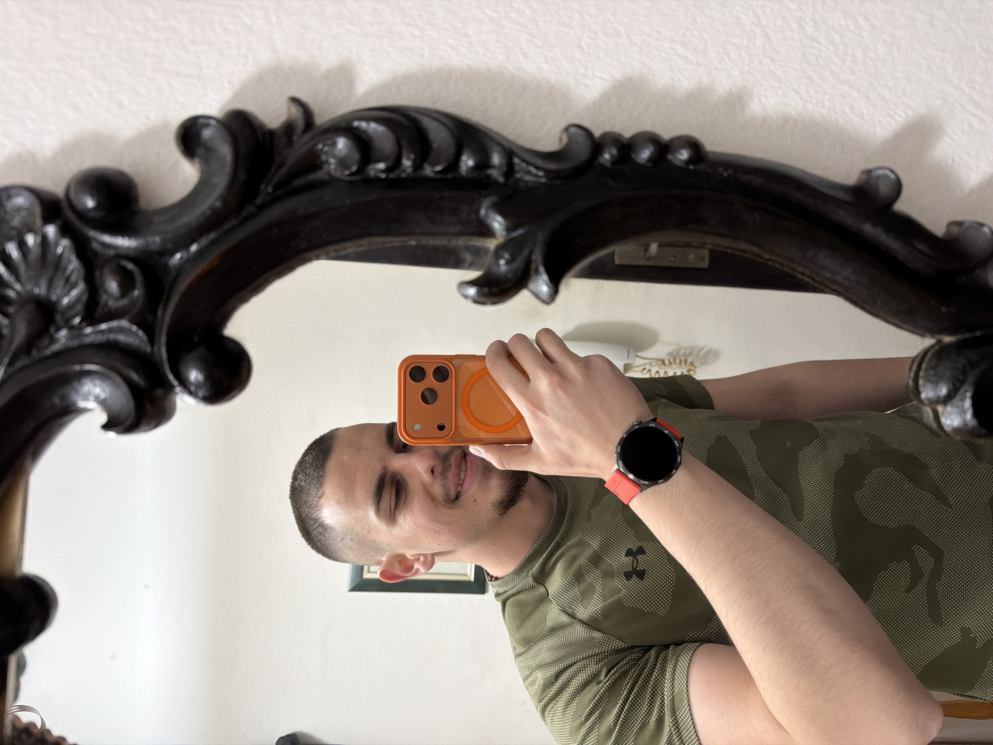 A light-skinned man is visible as a reflection in an ornate, dark-colored mirror. The man is holding a mobile phone in his left hand to take a photo of himself. He has short dark hair and a dark beard. He is wearing a green camouflage-patterned shirt and a black smartwatch with a red band on his left wrist. A framed picture is visible in the background of the mirror's reflection. The location is not discernible as Peshtera, Bulgaria.