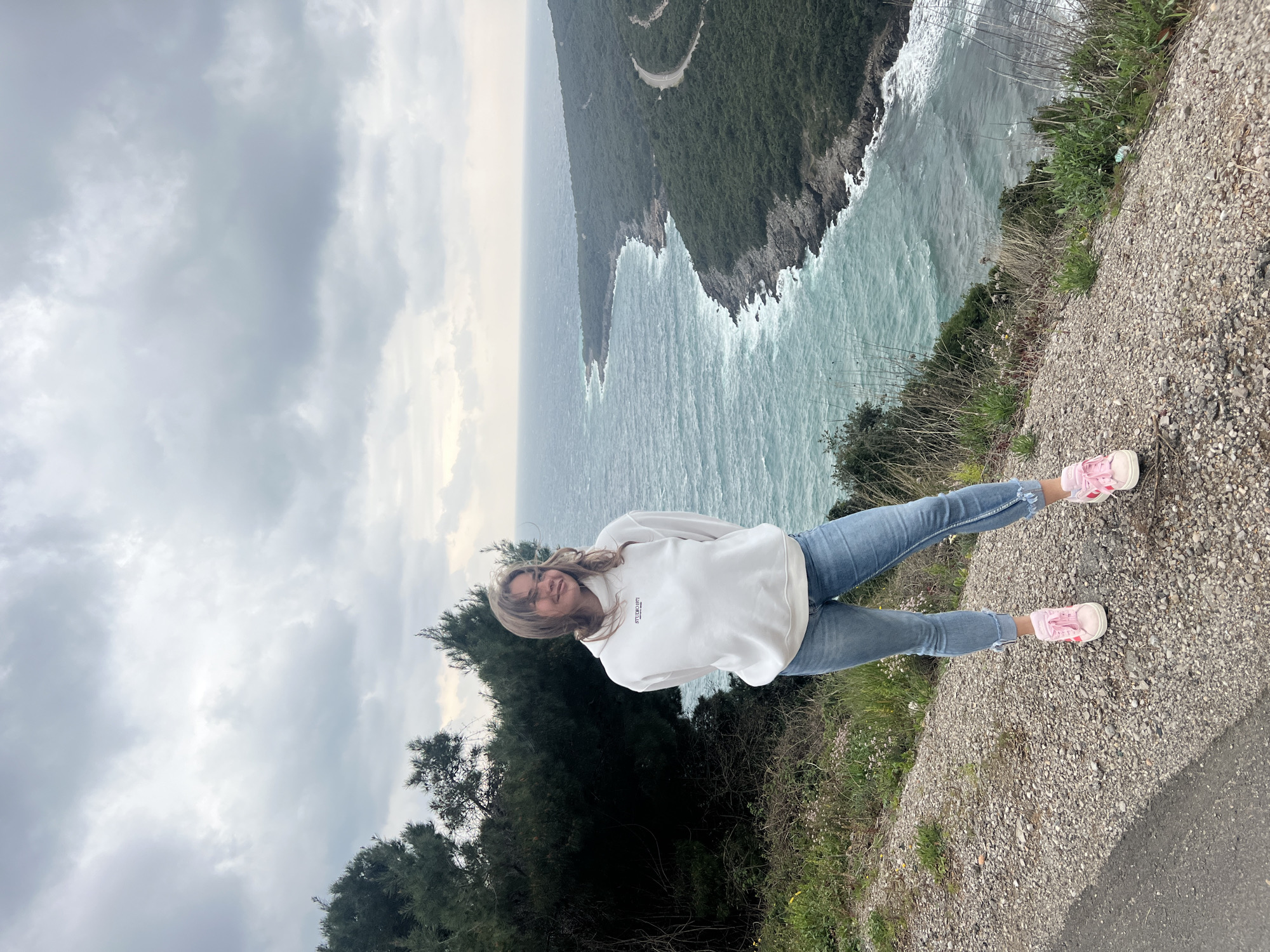 A young adult female stands on a gravel and dirt shoulder overlooking the Adriatic Sea in Dubraljevina, Montenegro, under an overcast sky
