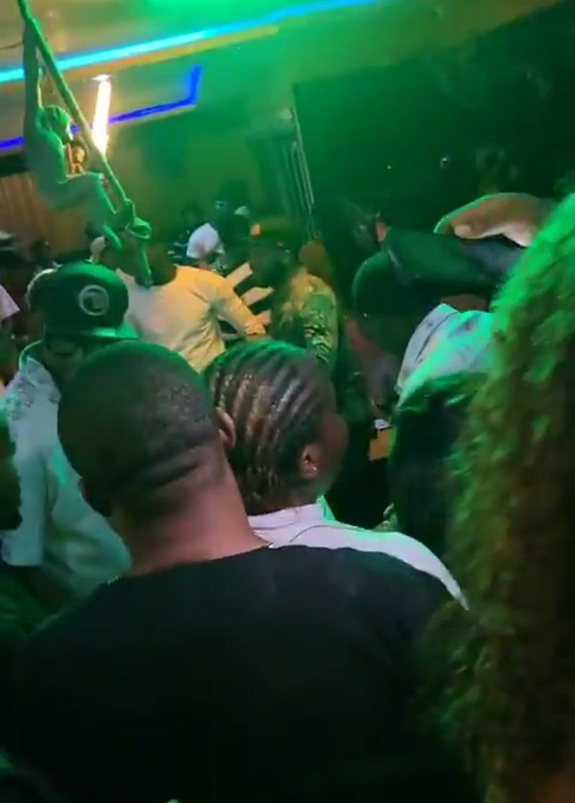 crowded nightclub with people dancing and celebrating. There are men and women, some dressed in casual clothes. The lighting is colorful and there are decorative lights on the ceiling. Sparklers are being held up in the crowd. The atmosphere is lively and festive.
