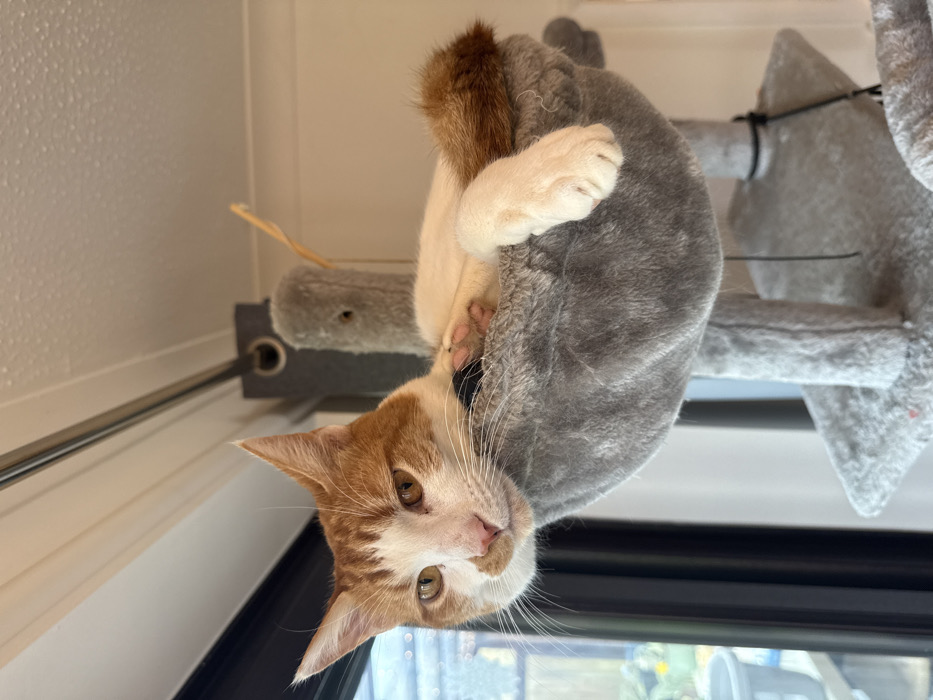 - "An orange and white cat hangs upside down from a gray, multi-tiered cat tree" by FM-5mf2w2, licensed under CC BY 4.0
