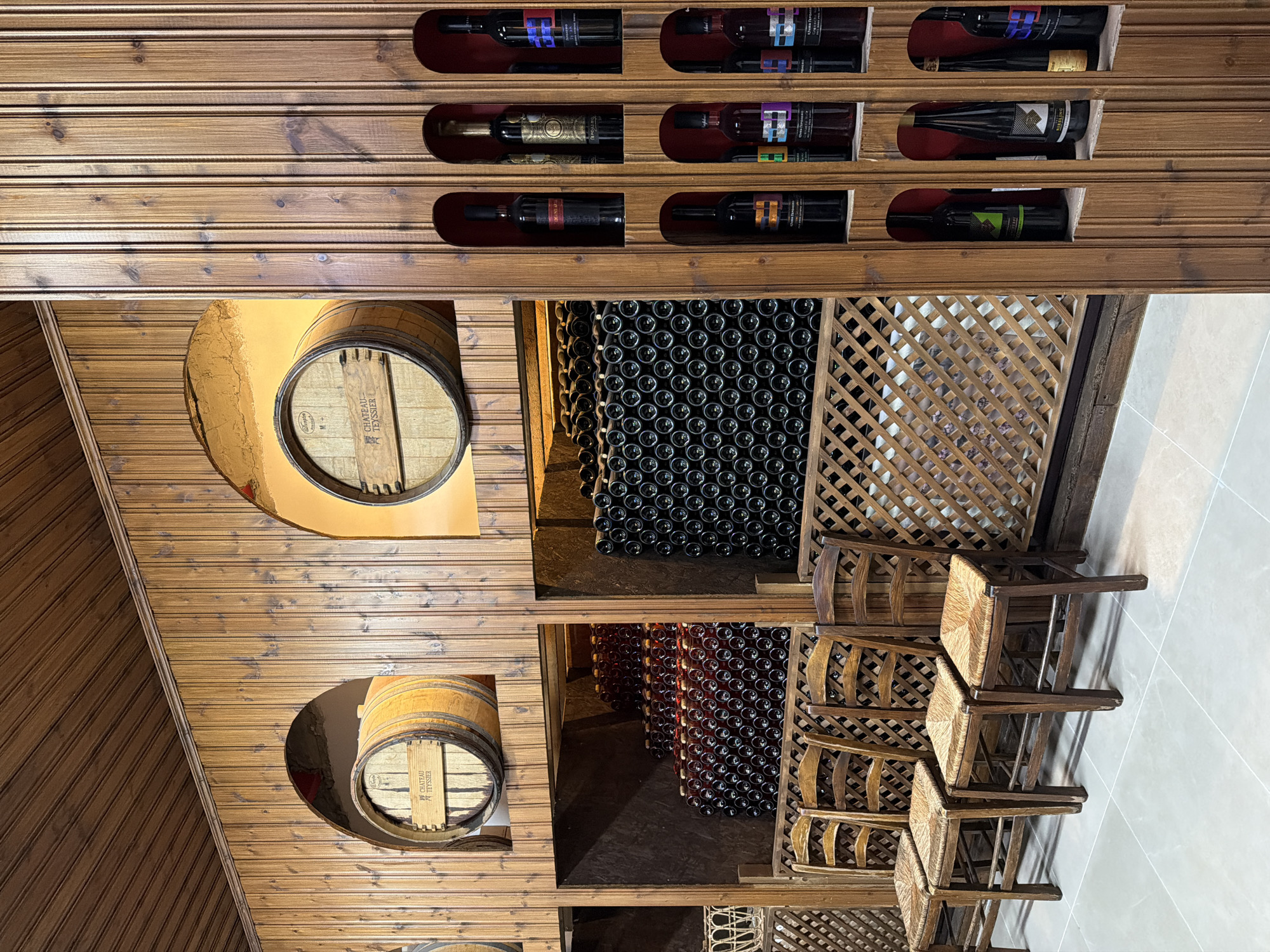 interior of a wine cellar, likely located in Omodos, Cyprus, judging by the wine barrels and bottle displays