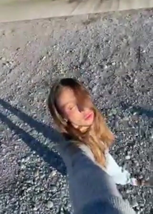 woman standing on a gravel lot, holding the camera at arm's length. She spins around in place while looking at the camera, causing her hair to move in the wind. The background consists of a low, light-colored building, a covered area with equipment inside, parked cars, and a clear blue sky.