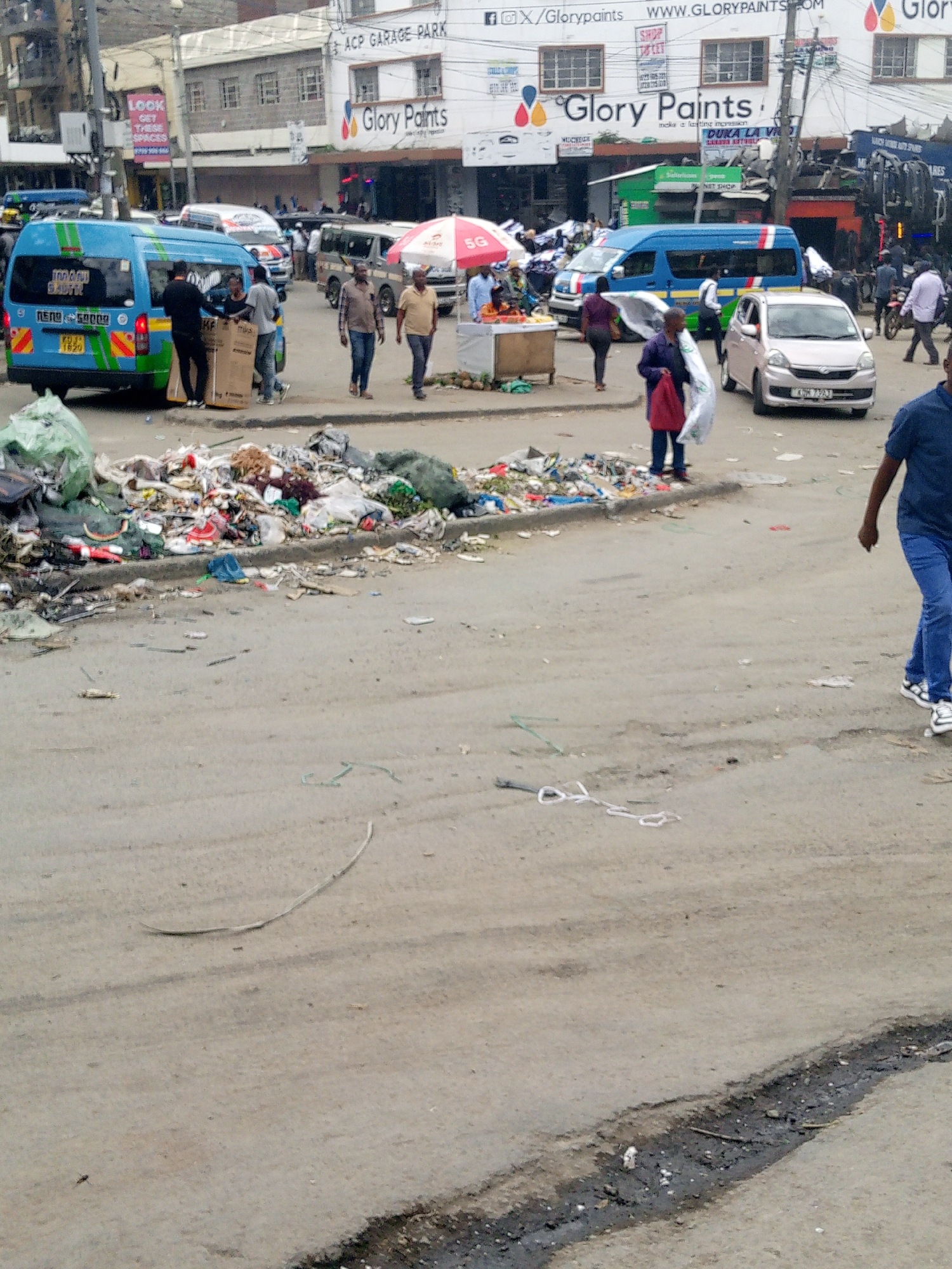 busy street scene in Nairobi, Kenya. The street is littered with garbage. Several people are walking or standing near the garbage pile. There are various vehicles, including a "matatu" minibus, a pink car, and other vans. Buildings line the street, with a prominent sign for "Glory Paints" and "ACP Garage Park" visible in the background. There is also a sign advertising "5G". People are engaged in various activities, such as loading items into a vehicle, walking, and standing near a market stall with a red umbrella. The street surface is cracked and uneven.
