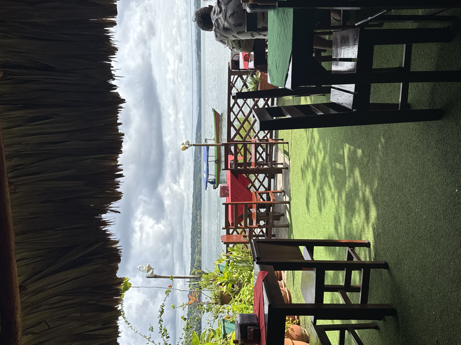 A waterside restaurant features dark wooden tables and chairs on artificial green turf. A thatched roof provides partial coverage. The cloudy sky and lake are visible in the background. Plants in pots adorn the foreground, while a fence separates the seating area from the water. A boat is docked nearby.