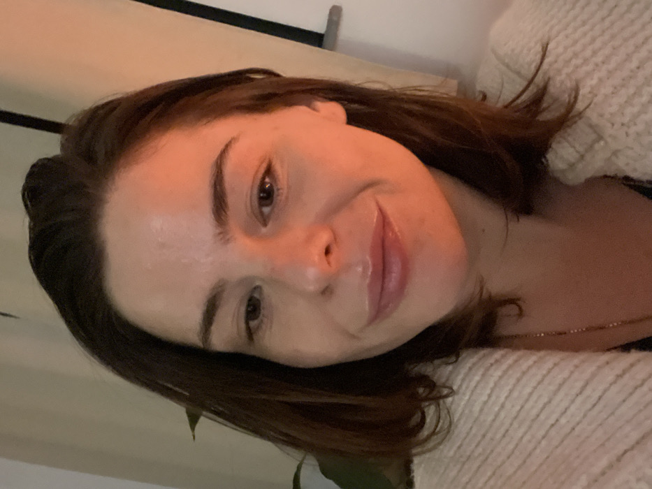 A woman with brown hair and fair skin smiles softly at the camera. She has dark eyebrows and eyes, and her lips appear to have a glossy finish. She is wearing a cream-colored knitted sweater. The lighting gives her skin a warm, orange-ish hue. The background is mostly out of focus. A slight shadow appears above her head.