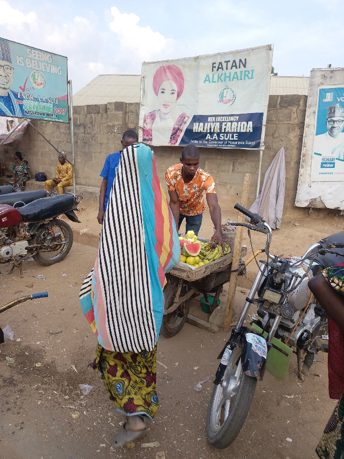 A street scene shows a fruit vendor with a cart laden with bananas, lemons, and watermelon slices. Several people are visible, including a person wrapped in a colorful striped cloth. Two motorbikes are parked nearby. Political posters hang on a brick wall in the background, featuring images of politicians with slogans. One poster reads "SEEING IS BELIEVING" and another shows "FATAN ALKHAIRI" alongside "HAJIYA FARIDA A.A SULE," the wife of the Governor of Nasarawa State.