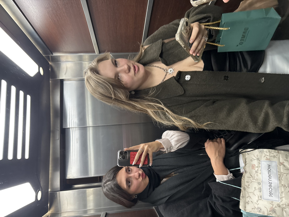 Two women take a selfie in an elevator. One, with blonde hair, wears a brown coat and a sun necklace, holding a phone and a green shopping bag. The other wears a black scarf and sweater with cuffed sleeves, holding her phone. The elevator's interior is stainless steel with bright fluorescent lights. Both women are facing the camera, pouting their lips.