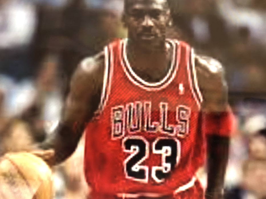 The image displays a close-up, cropped view of a male individual, appearing to be of African descent, from the chest up, rotated approximately 90 degrees clockwise. He is wearing a red sleeveless basketball jersey with white trim along the neck and armholes. The jersey features the word "BULLS" in white capital letters with a black outline, oriented vertically, and the number "23" in a similar style, also in white with a black outline. A light-brown basketball is partially visible in the upper left section of the frame, held by the individual's right hand. The background is heavily blurred, showing indistinct shapes and colors consistent with an indoor sports arena or court environment, possibly with spectators. The image quality exhibits pixelation and a visible grid pattern, suggesting it is a photograph of a digital screen or display. The image provides no identifiable geographical features or landmarks consistent with Kafr Sousa Municipality, Syria; the scene depicts a generic indoor basketball setting.
