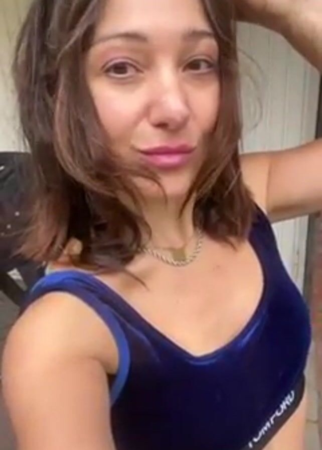 A fair-skinned woman with shoulder-length brown hair and pink lip gloss takes off dark sunglasses. She is wearing a navy blue velvet crop top with a Tom Ford elastic band. She is also wearing a layered silver-tone necklace. The background is out of focus and appears to be an outdoor area.
