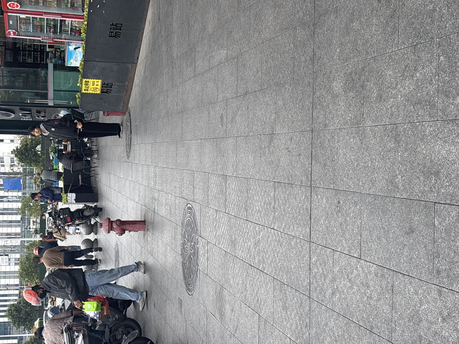 A sidewalk scene shows several people waiting near parked scooters and motorcycles. A red fire hydrant is visible near the center of the image. A person stands near an outdoor seating area, while others appear to be waiting for a service or transaction. A store building runs parallel to the sidewalk on the left. The scene is captured with a slight tilt, emphasizing the texture of the gray tiled sidewalk.