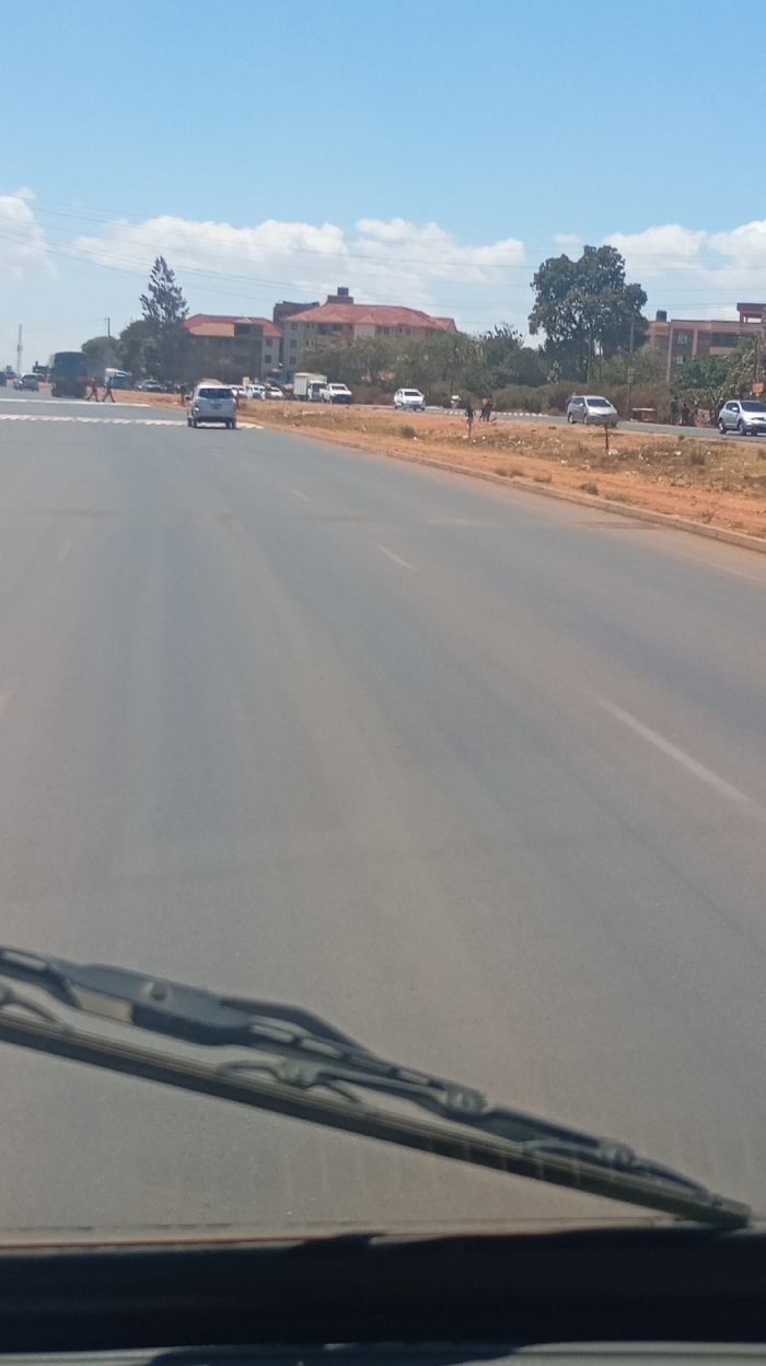 A wide, empty road stretches into the distance under a sunny sky. Buildings and trees line the roadside, with a few cars and pedestrians visible in the distance. The road surface is grey, and the verge is dry and reddish. The lower portion of the image shows the windshield and wipers of a vehicle from which the picture is taken.