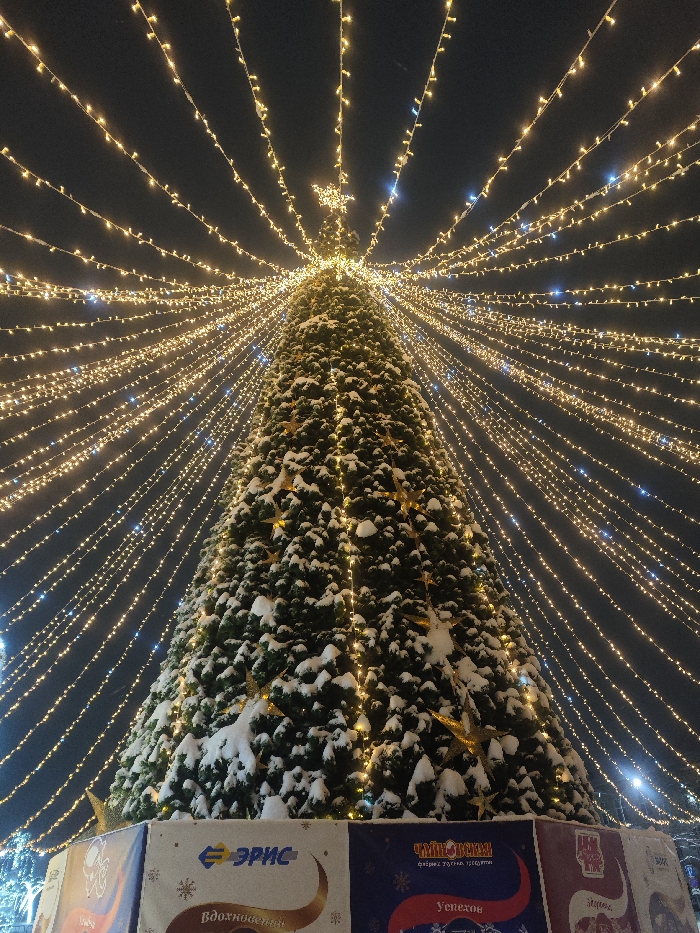 A tall, snow-covered Christmas tree is the focal point, adorned with golden star ornaments. Numerous strings of lights emanate from the top, creating a canopy effect against the dark night sky. The base of the tree is surrounded by advertising banners. Some blue lights are visible in the distance.