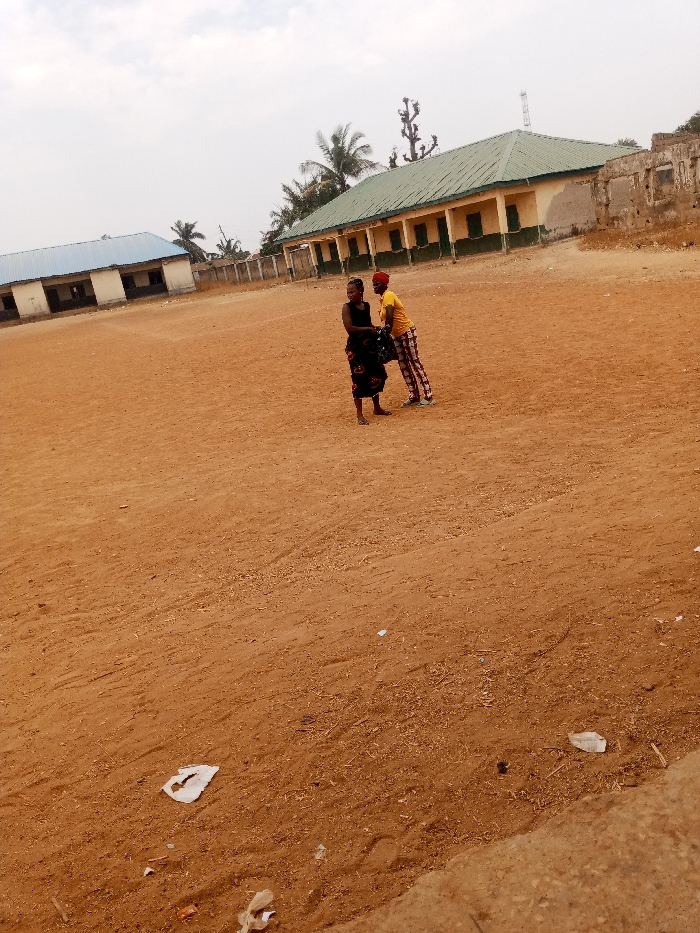 The scene depicts an expansive, reddish-brown dirt field in Akwanga, Nigeria, under an overcast sky