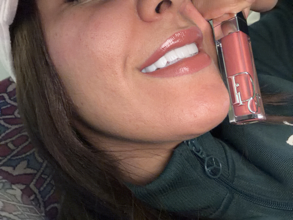 A woman poses close to the camera with a tube of Dior lip gloss held near her cheek. The gloss is a rosy coral shade with the Dior logo clearly visible. Her lips are coated with a similar glossy color, accentuating her white teeth. She wears a dark green zipped jacket. Her skin tone is warm, and her dark hair is visible near her face. The background is a patterned fabric or cushion.