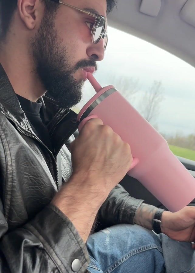 A man with a beard and sunglasses is driving a car. He is wearing a black leather jacket and blue jeans with rips in the knees. He is drinking from a large, pink tumbler with a straw. The car is moving on a highway, as seen through the windshield. The weather appears overcast.