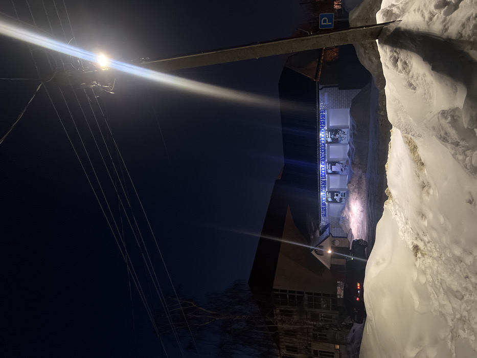 The image captures a nighttime street scene in Kambarka, Russia, specifically depicting the "ТВЦ "ВЕК" ЭЛЕКТРОНИКА" (TVC "VEK" Electronics) commercial building, likely located at Sovetskaya Street, 66. The foreground is dominated by large, uneven accumulations of snow, exhibiting some mixed dirt. A tall, grey utility pole stands on the right, supporting a single, bright streetlamp that emits a strong, elongated light beam downwards and across the frame. Multiple overhead utility lines extend from the pole across the dark night sky. Behind the utility pole, a blue square sign with a white 'P' symbol indicates parking. The primary subject is a one-story commercial structure with a light-colored brick facade and a dark, sloped roof. Above a series of four illuminated display windows, blue string lights are strung, spelling out "ТВЦ "ВЕК" ЭЛЕКТРОНИКА" in Cyrillic. The windows display electronic merchandise. A small, dark-roofed entrance alcove is present, with an illuminated circular emblem or sign above its door. A dark-colored SUV or truck is partially visible, parked in the snow in front of the commercial building, with its rear facing the viewer. The headlights of an unidentifiable vehicle illuminate the snow directly in front of the building's entrance area. To the left and rear of the commercial building, a darker, multi-story building is partially visible, partially obscured by bare tree branches silhouetted against the dark sky. No individuals are visible in the frame. The scene indicates a winter environment with heavy snow cover and artificial illumination.