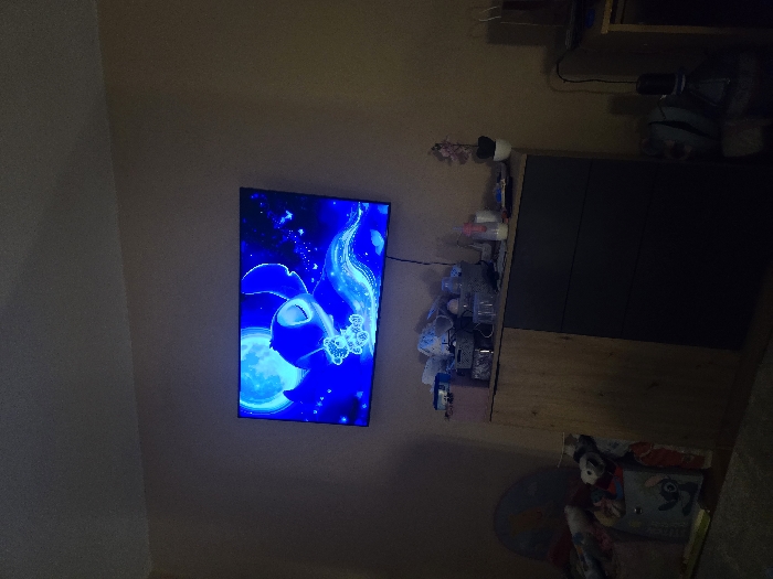 The image depicts an indoor residential setting, likely in Pleven, Bulgaria, although the specific address or neighborhood is not identifiable from the visual evidence. The scene is dimly lit, with walls painted a uniform, light, neutral color. A flat-screen television is mounted on the central wall, displaying an animated image of a large, blue, extraterrestrial-like character (resembling Stitch) holding a small teddy bear, set against a vibrant blue full moon and starry night sky. Below the television is a two-toned dresser or cabinet; its left section is light wood, and its right section features dark-colored drawers. The top surface of this dresser is cluttered with various items, including multiple baby bottles, organizing baskets containing miscellaneous objects, and a small pink artificial floral arrangement in a white pot on the far right. To the immediate left of the dresser, a light-colored fabric storage bin filled with toys or children's items is visible on the floor or a low surface. To the right of the dresser, a partial view of another dark furniture piece, possibly a small table, is present, with a black electrical cable extending from it towards the foreground, connecting to a dark cylindrical object. No individuals are visible.