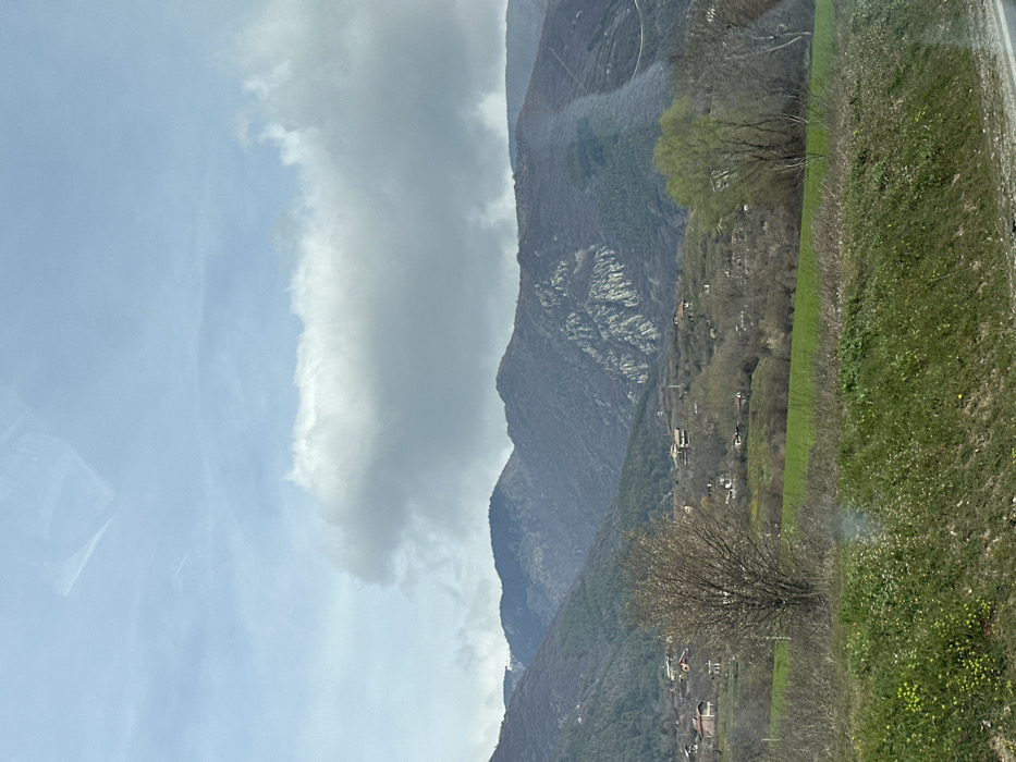 The image displays a panoramic landscape view of the area surrounding Anevo, Bulgaria, under a partially cloudy sky. The upper third of the frame features a light blue sky with scattered thin white clouds and a prominent horizontal band of denser greyish-white cumulus clouds. A faint, approximately rectangular reflection is visible on the upper left. The background consists of multiple layers of mountains, predominantly covered with dense, dark deciduous trees exhibiting sparse foliage, suggesting late winter or early spring. Patches of evergreen conifers are visible on some slopes. A distinctive, light-colored rocky outcrop is prominent on a central mountain. Distant peaks on the left show evidence of snow patches near their summits. In the mid-ground, a dispersed settlement of residential structures with reddish-brown roofs is visible on rolling hillsides. The immediate vicinity of these structures contains numerous bare trees and shrubs. The foreground presents a strip of elevated grassy terrain containing patches of green grass, dry brown vegetation, and small yellow and white wildflowers. A vibrant green cultivated field is situated behind this grassy strip. Two prominent trees stand in the mid-left: one with numerous bare, thin branches, and another taller tree to its right exhibiting nascent light green foliage, accompanied by a bare tree. No individuals or specific activities are discernible.