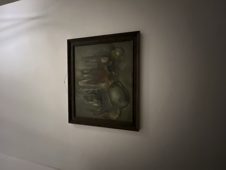 A framed painting hangs on a light-colored wall. The painting features a dark, muted color palette. Its content is abstract, depicting distorted figures and shapes. A prominent, rounded form resembling a head is visible near the top. The artwork has a shadowy and obscured quality. The frame is dark brown and ornate.