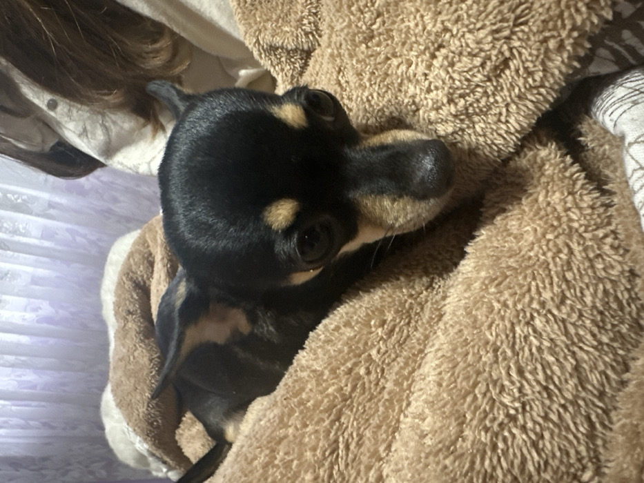 - "A black and tan Chihuahua-type domestic dog is observed resting within a light brown, high-pile blanket" by FM-kvwHa2, licensed under CC BY 4.0