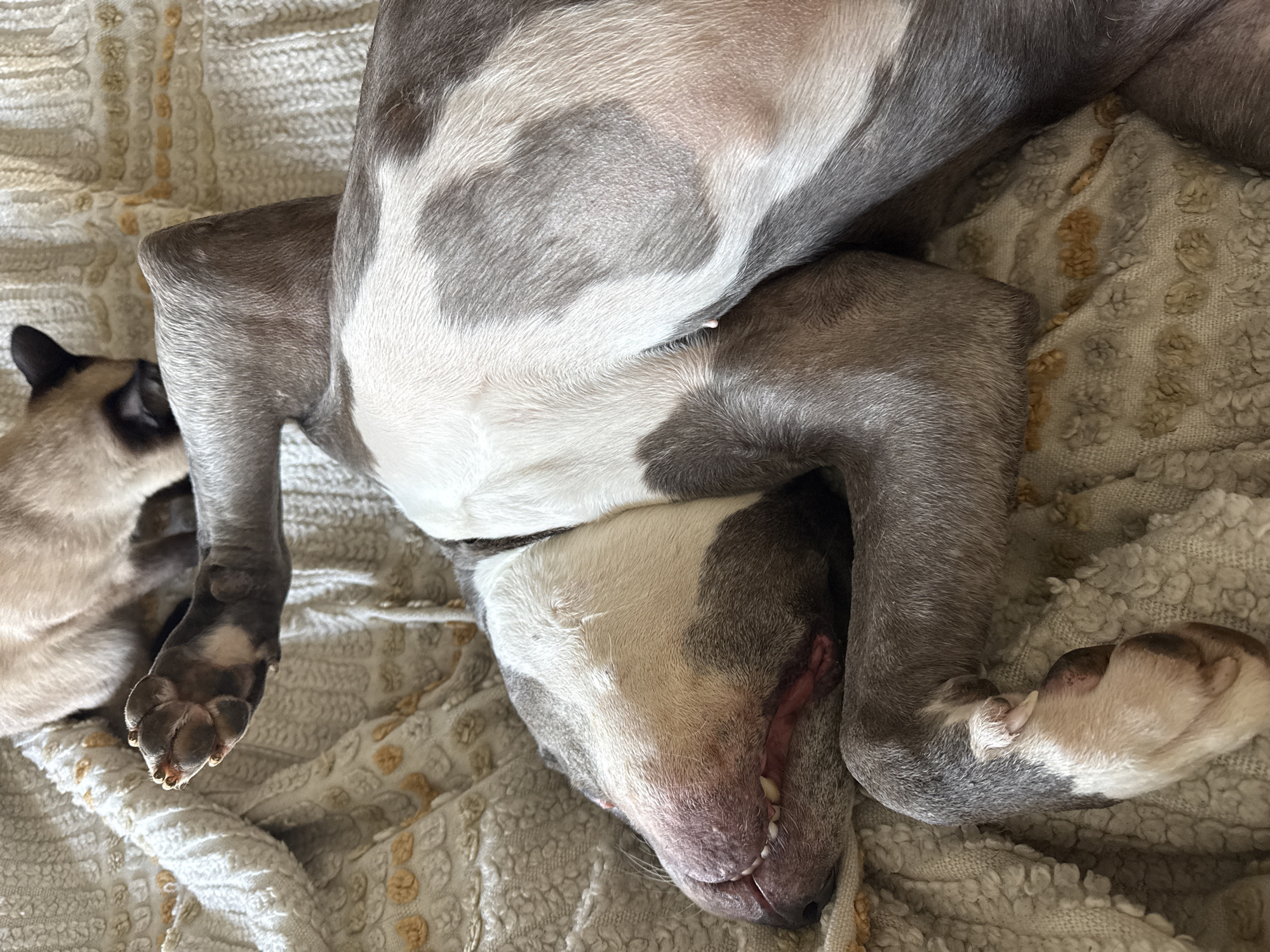 - "A tan and black Siamese cat is near a blue and white pit bull laying upside down on an off-white blanket" by FM-euyLP2, licensed under CC BY 4.0