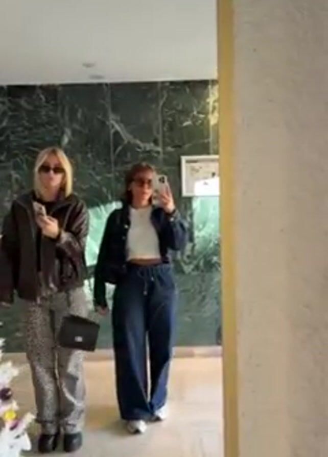 Two young women are standing side-by-side in front of a mirror, each holding a smartphone and seemingly taking selfies. The woman on the left has blonde hair, is wearing sunglasses, a dark brown jacket over a black top, leopard-print pants, and black shoes. She has a small black purse slung over her shoulder. The woman on the right has shorter brown hair, also sunglasses, a dark denim jacket over a white crop top, wide-leg dark blue pants with a drawstring waist, and white sneakers. Behind them, a wall is covered in green marble with white veining, and there is a framed notice or sign on the wall. To the left of the frame is a small white Christmas tree adorned with colorful ornaments and wrapped gifts at its base. The mirror is framed in gold. The lighting is bright and even, suggesting a well-lit indoor space.