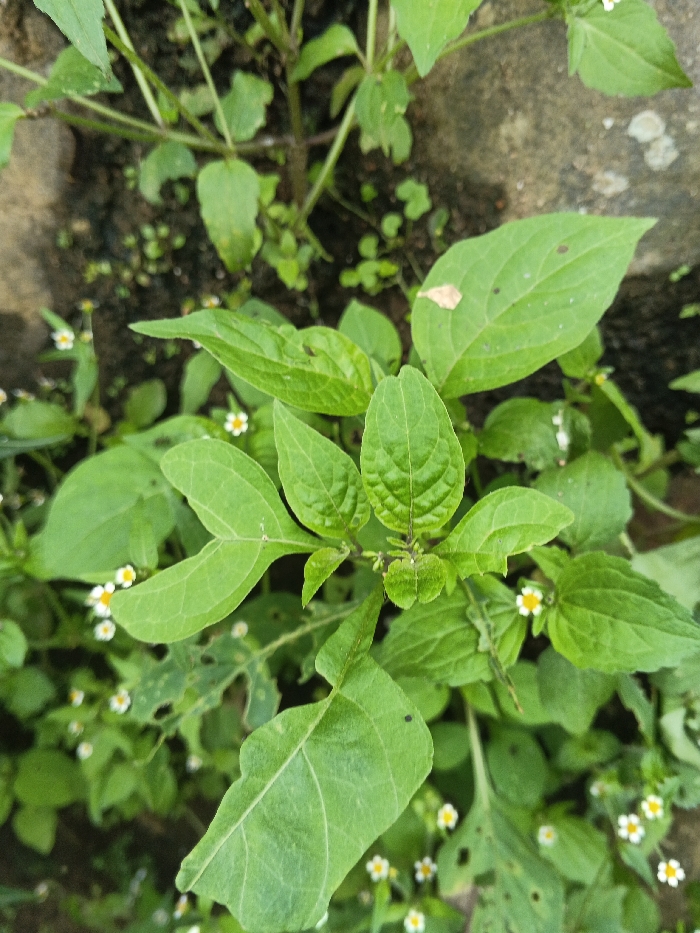 Lush green foliage dominates the scene, showcasing a variety of plant types. Broad leaves with visible veins are prominent, intermixed with smaller, rounded leaves. Tiny white flowers with yellow centers are scattered throughout the greenery, adding a delicate contrast. Some leaves exhibit signs of insect damage. A section of grey concrete can be seen in the upper portion of the image.