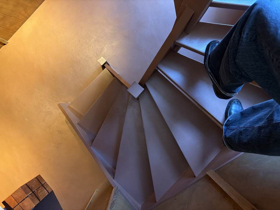 The image displays a high-angle view looking down a winding wooden staircase within an interior space in Brussels, Belgium. The lower legs and feet of an individual, clad in dark blue jeans and dark shoes, are visible at the bottom of the frame, positioned on the upper steps of the staircase. The staircase features dark reddish-brown wooden steps and a matching railing system, with a square newel post or support visible midway down the descent. The floor at the base of the staircase, visible in the upper portion of the image, is a warm, ochre-colored surface, possibly concrete or polished stone, illuminated by an intense orange light source from above. In the upper left corner of this illuminated floor, a stack of roughly cut wooden blocks, exhibiting visible grain, is present. The staircase itself and the lower sections of the image are rendered in cooler, darker tones, indicating a transition from direct illumination to shadow.